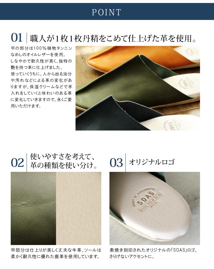 ルームシューズ スリッパ 本革 レザー 日本製【SOAS】スリッパ 牛革 鹿革 なめし おしゃれ レディース メンズ プレゼント 室内履き 男性 来客用 ブランド 国産 レザースリッパ ギフト 部屋履き 敬老の日 敬老の日ギフト